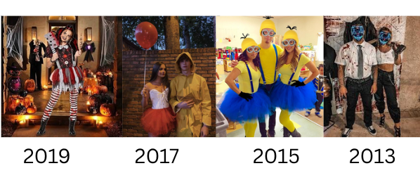 2017: After the release of the movie IT in 2017, the clown costume gained popularity. It was similar to 2019, but now the killer clown Pennywise took the spotlight.